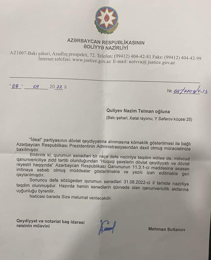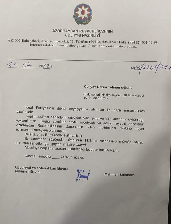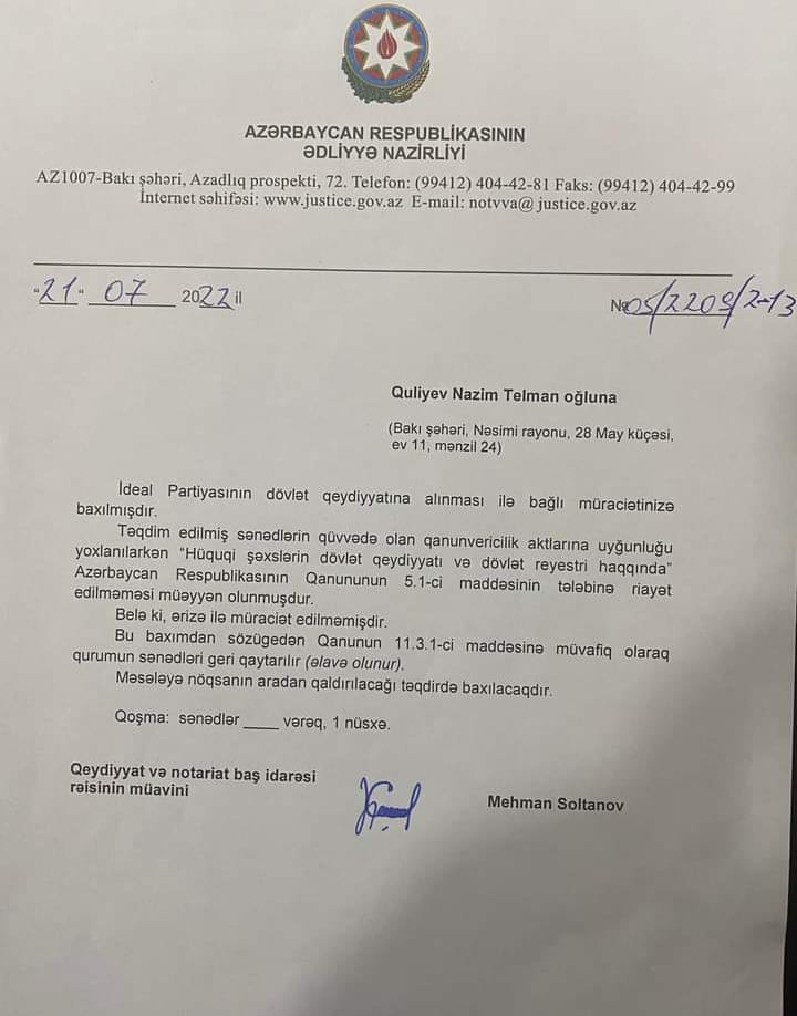 İDEAL Partiyasının qeydiyyata alınmaması məqsədilə hökumət adından Mehman Soltanov dövriyəyə buraxılıb.