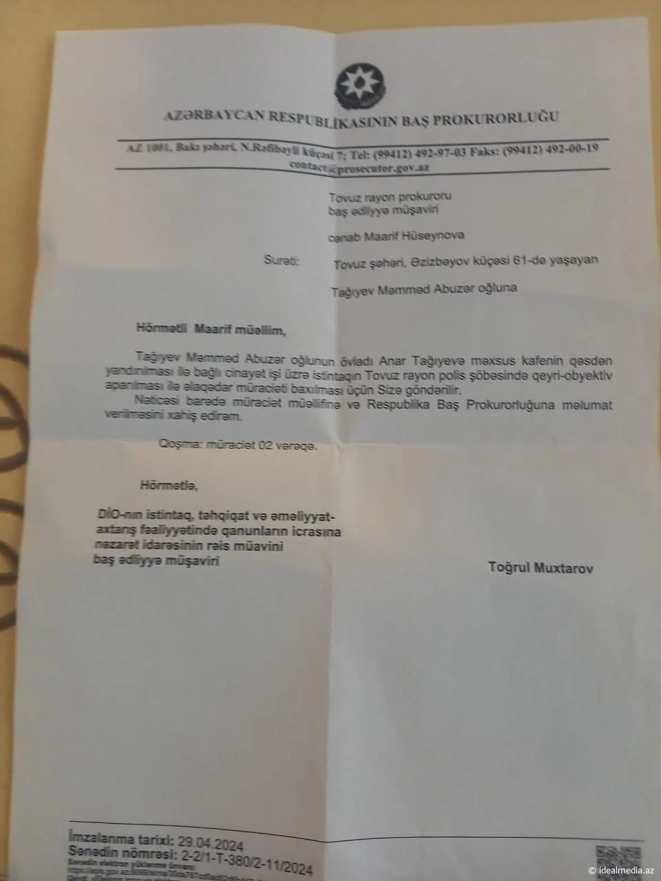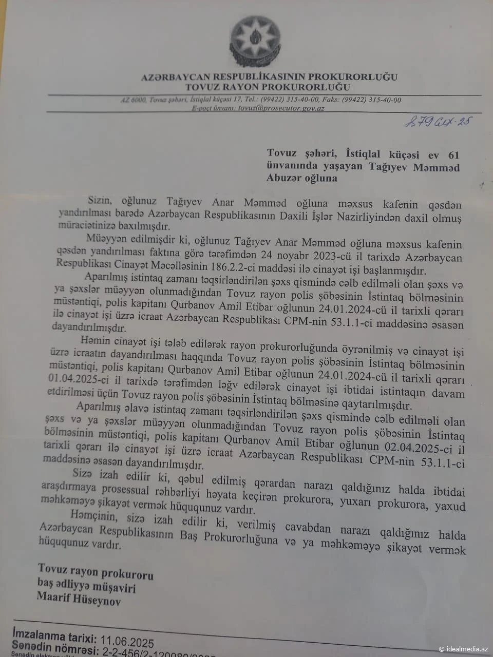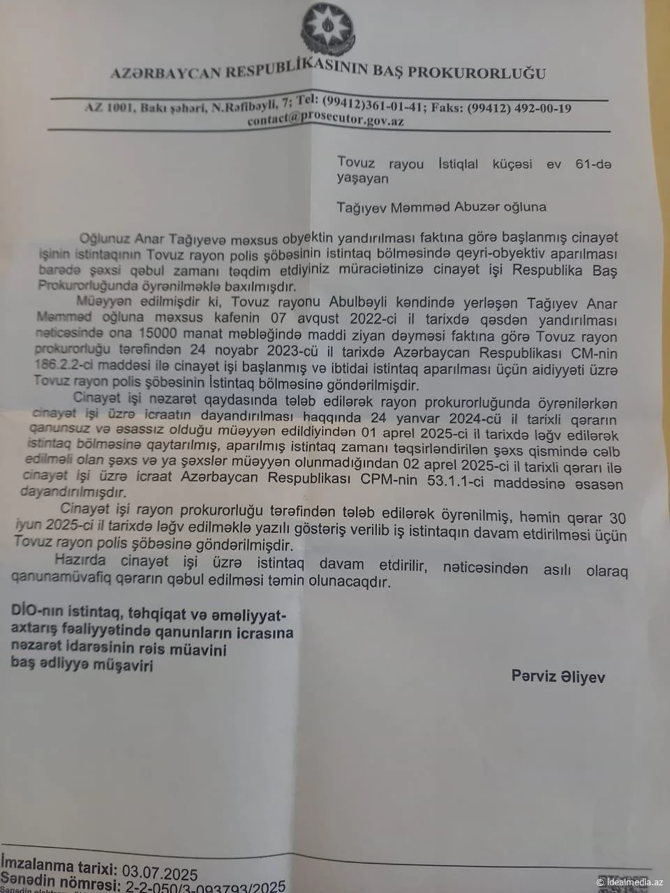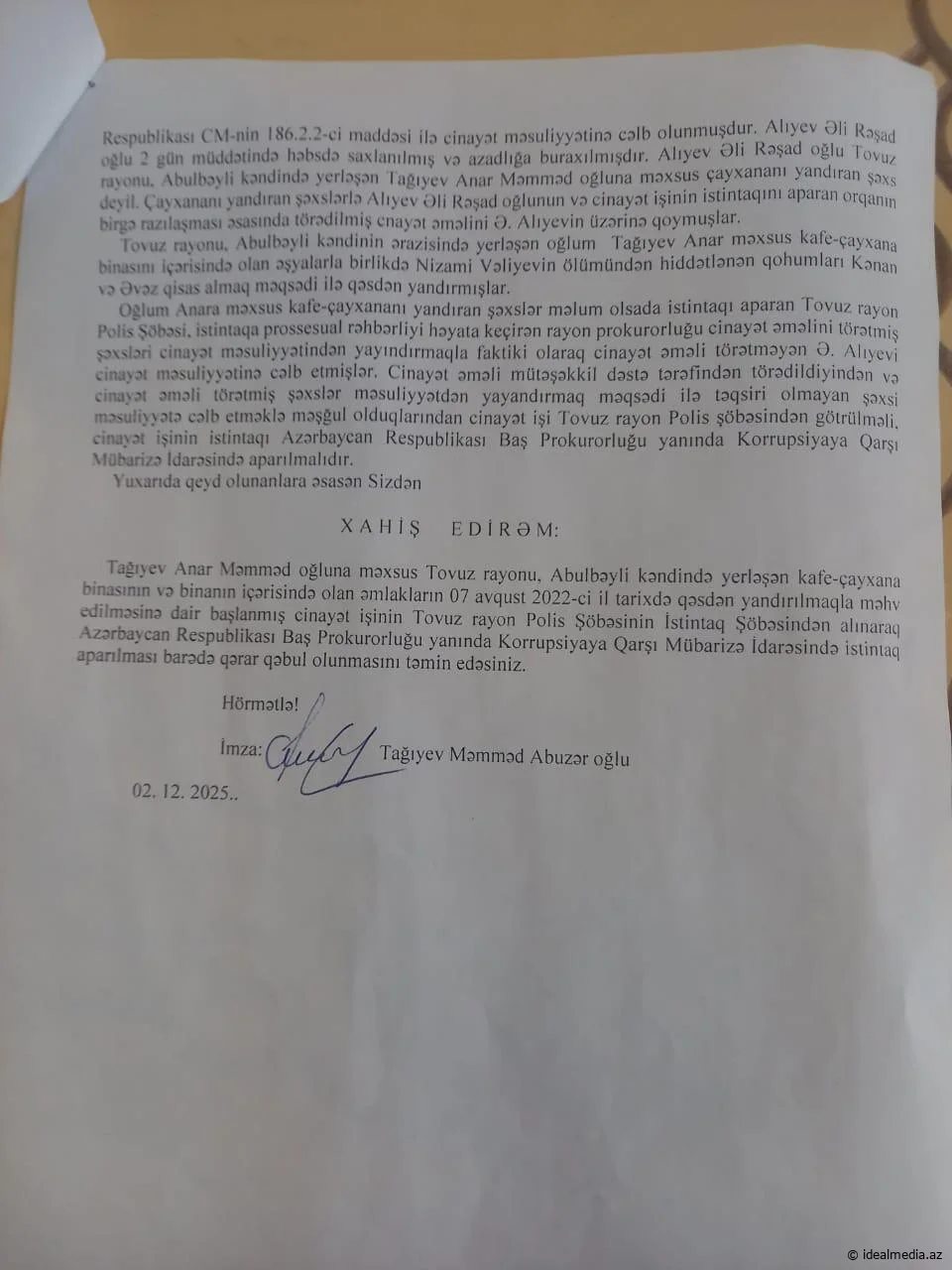 Tovuz şəhəri, Əzizbəyov küçəsinin sakini Tağıyev Məmməd Abuzər oğlu "İdeal Media Mərkəzi"nə müraciət edərək, 2022-ci ilin iyul ayında 100 kvadrat metr sahəsi olan obyektini yandıran şəxslər, Tovuz Rayon Polis İdarəsinin olaya qərəzli münasibət sərgiləməsindən və ailəsinə dəymiş maddi və mənəvi ziyanın ödənilməməsi, hadisəni törətmiş şəxs və şəxslərin hələ də cinayət məsuliyyətinə cəlb edilməməsindən bəhs edir.