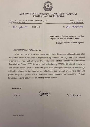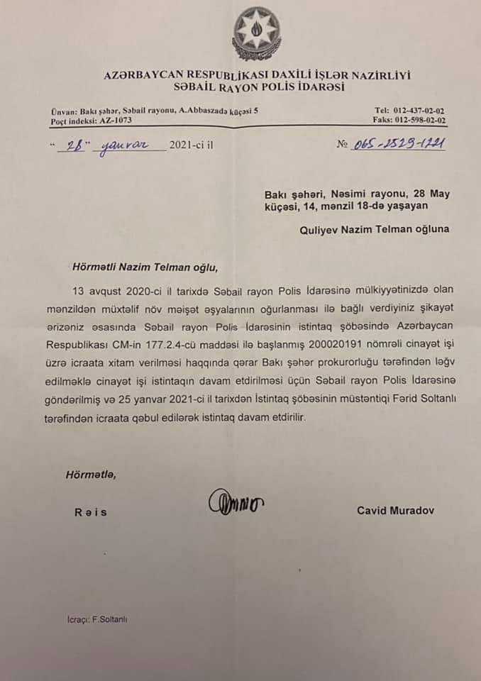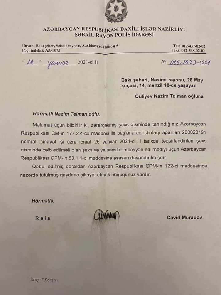 Digərində Bakı Şəhər Prokurorluğu Səbail rayon polis idarəsinin qərarını ləğv edib yenidən baxılması üçün müstəntiq Fərid Soltanlının icraatına verildiyi bildirilir.