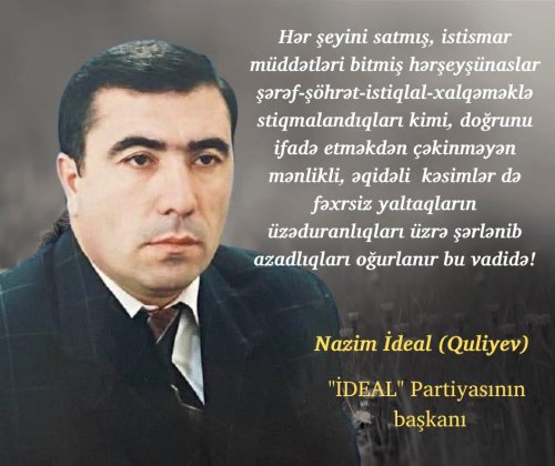 NAZİM İDEAL Tarix: 08.03.2022 / 17:29 • Oxundu: 35 dəfə • Gündəm Tarixin şəxsiyyəti,şəxsiyyətin tarixi.. 17-05-2021, 14:00 Gündəm Nazim İdeal - 555.. 11-07-2021, 20:14 Gündəm NAZİM İDEAL-555.. 15-01-2021, 20:35 Gündəm NAZİM İDEAL: 8 aylıq hamilə Xatun və Xalqın.. 16-02-2021, 14:43 Gündəm Özünü tanımayanlar NAZİM İDEALI tanımaz!.. 24-03-2021, 23:46 Gündəm Övladımı itirməyə hazıram lakin..... 25-12-2021, 08:44