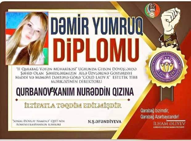 Şərəfsizə şərəf, əxlaqsıza şöhrət, namussuza tərəqqi, bədən alverçilərinə xalq-əmməkdar fəxri adlar veriləndə ONLARLA Vətəndaşa "lotereya" zərəri vurmuş Xanım Qurbanovayada "Dəmir Yumruq" diplomunun verilməsi təbii haldır.